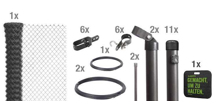 Bei diesem Alberts® Komplettset Maschendrahtzaun sind alle Komponenten inklusive, die Sie für einen gerade Verlauf zum Einbetonieren benötigen. Das Maschendrahtgeflecht besteht aus verzinktem Draht und ist punktgeschweißt mit anschließender Polyesterbeschichtung in der farbigen Ausführung.