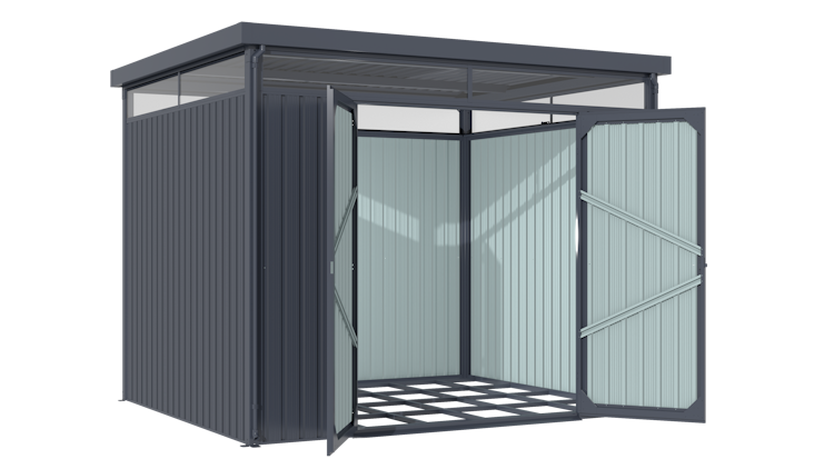 • Komfortables Gerätehaus mit Pultdach, breiten Türen und Lichtband