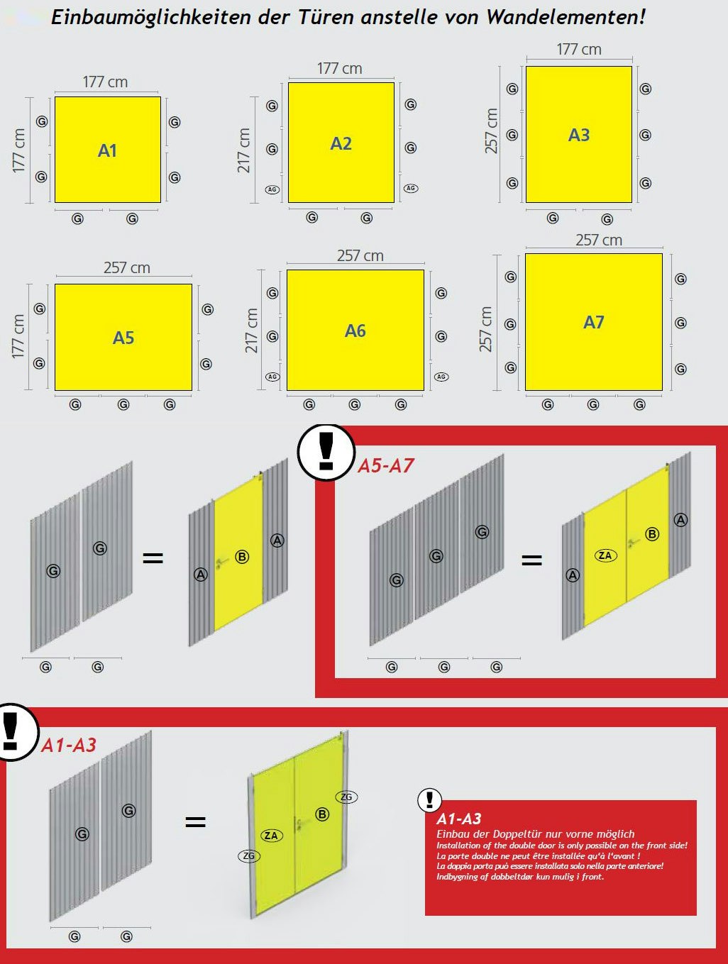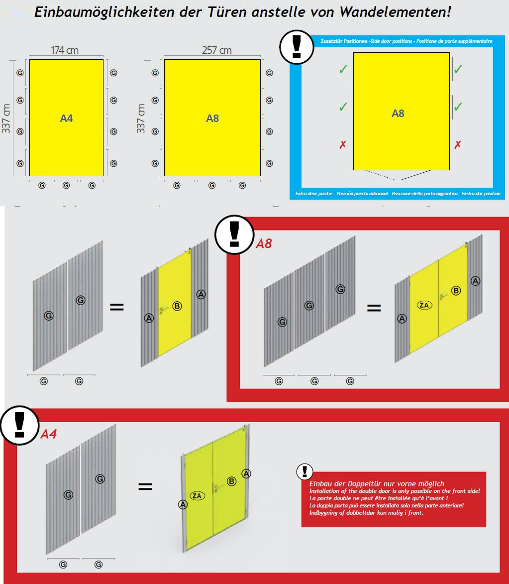 | Türposition | Positionierung der Türe (kann beim Aufbau durch Tausch der Wandelemente umgesetzt werden): L: An langer Seite (260 cm) Einzel- oder Doppeltüre möglich, an schmaler Seite (180 cm) nur Einzeltüre möglich XL: Einzel- oder Doppeltür an allen Seiten möglich XXL: Einzel- oder Doppeltür an allen Seiten möglich neue Größen: A1, A2, A3, A5, A6, A7: siehe Infografik A4, A8: siehe Infografik Übersicht mögliche Türpositionen mit Skizzen |