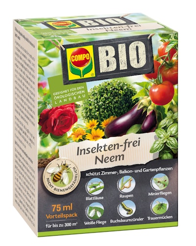 Das COMPO BIO Insekten-frei Neem ist ein Insektizid aus Pflanzenextrakt mit breitem Wirkungsspektrum. Es ist wirksam gegen saugende, beißende und blattminierende Insekten, wie z.B. Blattläuse, Weiße Fliegen, Kartoffelkäfer, Buchsbaumzünsler an Zierpflanzen, Kartoffeln, Gemüsekulturen und Kräutern. Es ist nicht bienengefährlich.