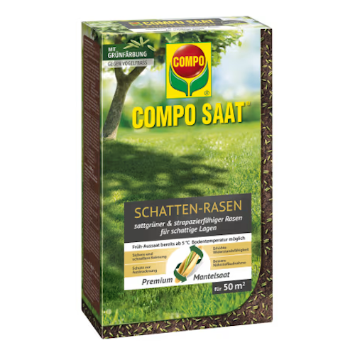 Diese besonders hochwertige Rasensamen-Mischung COMPO SAAT Schatten-Rasen, bestehend aus schattenverträglichen Samen-Arten, eignet sich hervorragend zur Anlage von Rasenflächen mit schattiger und halbschattiger Lage. Aufgrund von langsam wachsenden Grassorten in dieser Qualitäts-Saatgut-Mischung ist der heranwachsende Rasen zusätzlich auch enorm pflegeleicht. Die spezielle Auswahl an leistungsfähigen Grassorten sorgt für eine sichere Keimung sowie für eine gute Rasennarbenbildung und verhelfen den wachsenden Keimlingen zu einem sattgrünen, gesunden und belastbaren Rasen, der weniger anfällig für Rasenkrankheiten (z. B. Rotspitzigkeit) ist und sich besser gegen die Bildung von Moos und Unkraut durchsetzt. Eine sichere Keimung ist dank der innovativen Profi-Saatgutveredelung mit BIO-Saathülle garantiert.