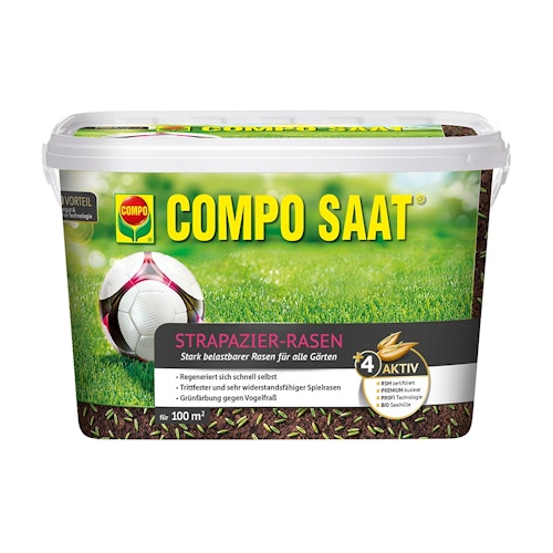 Als spezielle Rasensamen-Mischung ausgewählter Spitzensorten, u.a. aus Sorten mit einer guter Rasennarbenbildung, eignet sich der COMPO SAAT Strapazier-Rasen besonders zur Anlage von Spiel- und Sport-Rasen mit normaler bis hoher Belastung. Die qualitativ hochwertige Saatgut-Mischung aus leistungsfähigen Grassorten verhelfen den jungen Rasenpflanzen zu einer schnell dichten, sattgrünen, sehr strapazierfähigen Rasenfläche, die sich binnen kürzester Zeit selbst regeneriert. Die Widerstandsfähigkeit des Rasens wird zudem ebenfalls erhöht, wodurch dieser deutlich weniger anfällig für Rasenkrankheiten (z. B. Rotspitzigkeit) wird und sich auch besser gegen die Bildung von Moos und Unkraut durchsetzen kann. Dank der innovativen Profi-Saatgutveredelung mit BIO-Saatguthülle ist eine sichere Keimung auch bei ungünstigen Umweltbedingungen möglich. Die Rasensamen sind dank ihrer einzigartigen Grünfärbung vor Vogelfraß gut geschützt.
