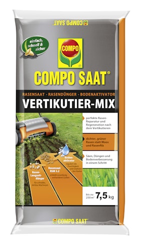 Ein schöner, dicht wachsender Rasen muss nicht immer mit vielen Arbeitsschritten verbunden sein: Der anwendungsfertige COMPO SAAT Vertikutier-Mix verbindet Rasensamen, Rasendünger und Bodenaktivator in einem Produkt. Moos, Unkraut und Rasenfilz sowie Lücken im Rasen sind die Spuren, die nach dem Winter den Rasen unschön aussehen lassen. Für die neue Gartensaison erhält der Rasen die notwendige Pflege und Nährstoffe in nur einem Arbeitsschritt, um wieder frisch und gesund auszusehen. Die Zusammensetzung der einzelnen Bestandteile ist optimal für die Regeneration und Rasen-Reparatur aufeinander abgestimmt. Schnell keimende Raasensaatmischung ist zuständig für einen strapazierfähigen Rasen mit guter Regenerationsfähigkeit und schließt vorhandene Lücken. Für eine sichere Nährstoffversorgung sorgt der Startdünger mit 2 bis 3-monatiger Langzeitwirkung. Der enthaltene Bodenaktivator dient zur Feuchtigkeitsregulierung  und Bodenvitalisierung.