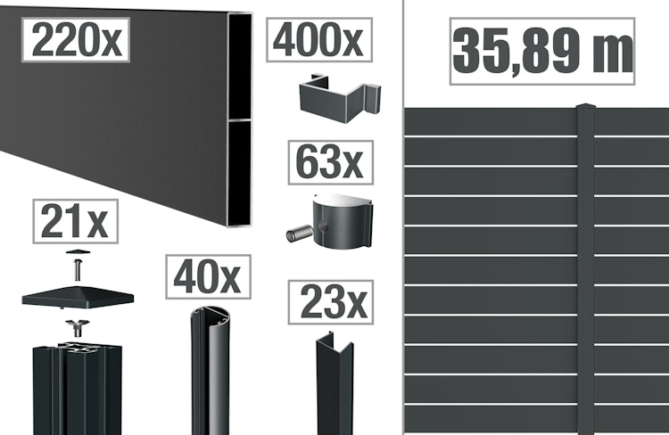Das Set beinhaltet Einzelprofile, Distanzstücke, Pfosten, Profiladapter und Abdeckleisten.