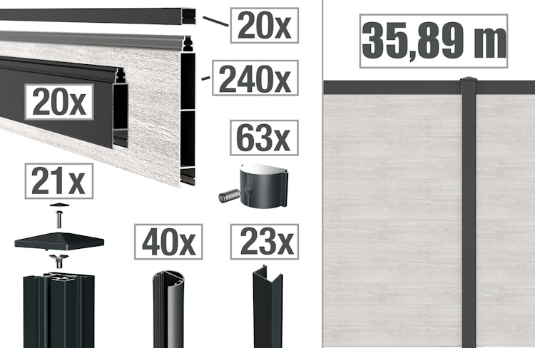 Das Set beinhaltet Einzelprofile, Abschlussleiste, Pfosten, Profiladapter und Abdeckleisten.