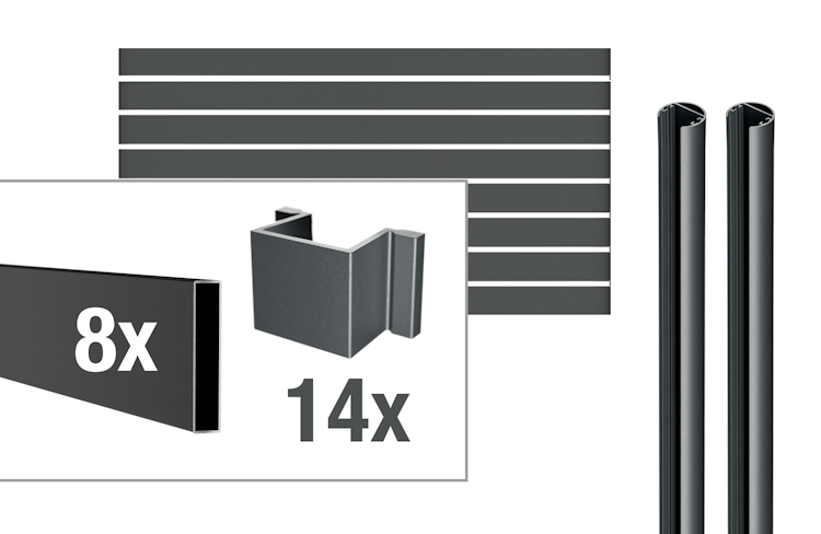 | Lieferumfang | Rechteck-Profile entsprechend der Höhe Distanzstücke 18 mm Profiladapter für Pfosten 90/90 mm |