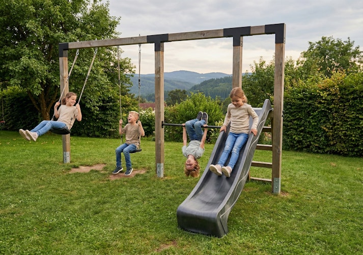 Die EXIT Linea Robust 110 Doppelschaukel mit Reckstange und Rutsche aus stabilen Douglasienholz-Pfosten bietet mit zwei anthrazitfarbenen Schaukeln, einer 125 cm breiten Reckstange und einer Rutsche ein sicheres und langlebiges Spielvergnügen im Garten. Das robuste, wartungsarme Gestell überzeugt durch hohe Stabilität, moderne Optik und ein nachhaltiges, reparierbares Design.