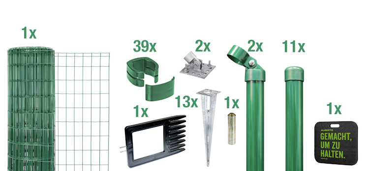 Bei diesem Alberts® Komplettset sind alle Komponenten inklusive, die Sie für 10 / 25  gerade Laufmeter Gitterzaun mit Bodenhülse benötigen.