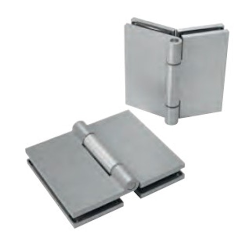 Doppel-Türbander eckig aus hochwertigem Aluminium, für Glas-Glas Montage. Öffnungswinkel 135° (für Saunen mit Eckeinstieg). Geeignet für private und gewerbliche Anwendungen mit einer Glasstärke von 8 und 10 mm.