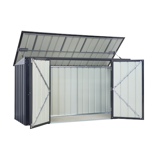 Das Pultdach sorgt für eine gleichbleibende Höhe und die schnelle Ableitung von Niederschlag. Sie können mittels des installierten Verschlussriegels unkompliziert auf- und abgeschlossen werden.