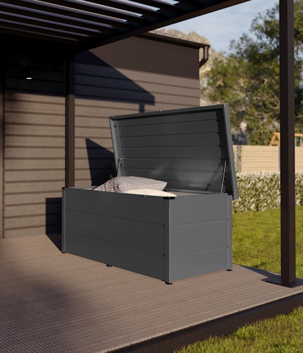 Die hochwertige Hörmann Gartenbox Juno aus robustem, beidseitig Coil-Coating-beschichtetem Stahl überzeugt durch ihr modernes Design und bietet dauerhaften Schutz für alles, was Sie im Garten oder auf der Terrasse trocken und sicher verstauen möchten. Ideal zur Aufbewahrung von Sitzkissen, Gartengeräten, Spielzeug oder Werkzeug. Die Juno Gartenbox ist in zwei Größen und zwei attraktiven Farben erhältlich – so finden Sie für jeden Außenbereich die passende Lösung.