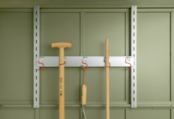 Der Hörmann Gerätehalter für das Gerätehaus Berry bietet eine praktische Möglichkeit, Gartengeräte ordentlich zu verstauen. Er wird einfach an der Wand montiert und sorgt dafür, dass Werkzeuge sicher und griffbereit aufbewahrt werden. So bleibt das Gerätehaus aufgeräumt und gut organisiert.