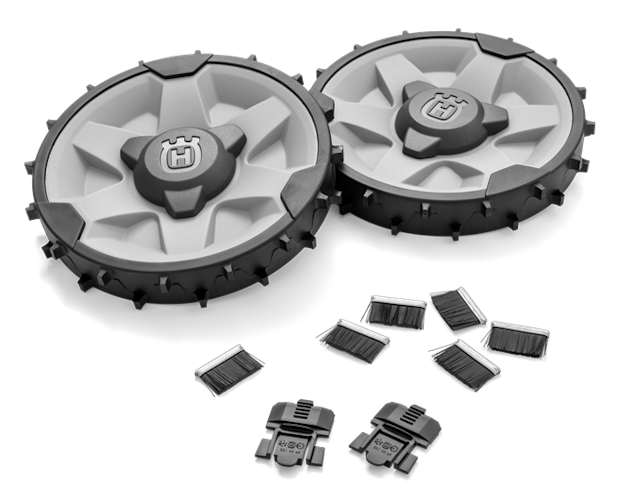 Das Husqvarna Offroad-Kit AM 305 ist für eine hervorragende Traktion auf abfallenden Rasenflächen mit schweren Hinterrädern und Radbürsten ausgestattet.