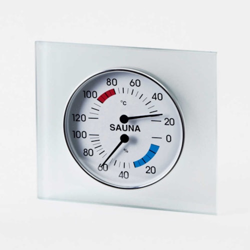 Infraworld Klimamesser mit Glasrahmen zur Überprüfung von Temperatur und Luftfeuchtigkeit in der Sauna.