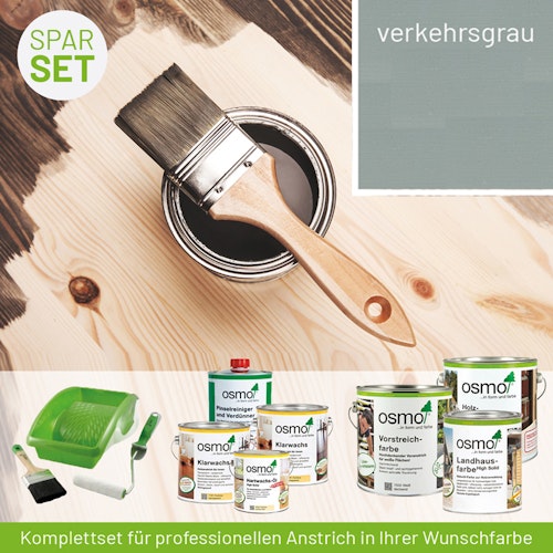 Innen- und Außenanstrich Komplettset für Gartenhäuser bis 5 m² Grundfläche (Deckfarbe). Dieses Osmo Anstrich-Komplettset enthält alles, was Sie für einen professionellen, deckenden Anstrich Ihres Gartenhauses (außen deckend, innen farblos) benötigen: Holzschutz-Grundierung, Vorstreichfarbe weiß, deckender Endanstrich in Wunschfarbe, weißer Kontrast-Endanstrich für Türen, Fenster und Blenden, Fußboden Hartwachs-Öl, Klarwachs für Innenwände und Fenster/Türen, Farbwanne inkl. Abstreifrillen, Einwegeinsätze (3 Stück), Mikrofaserrolle (100 mm breit), Steckbügel, Flächenstreicher (60 mm breit) und 1 Liter Pinselreiniger. Ersparnis ggü. Einzelkauf: ca. 10%.