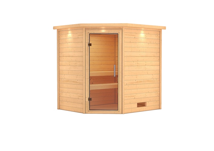 Karibu Woodfeeling Sauna Mia - 38 mm Massivholz Aktionssauna mit Eckeinstieg inkl. Ganzglastür, Ofenschutzgitter und Fichtenholzbänken. Optional können Sie einen Dachkranz mit 3 LED-Strahlern dazu bestellen. Lieferung je nach Wunsch ohne Ofen oder mit einem 9 kW (integrierte Steuerung), 9 kW (externe Steuerung) oder 9 kW Bio-Kombiofen (externe Steuerung) möglich.