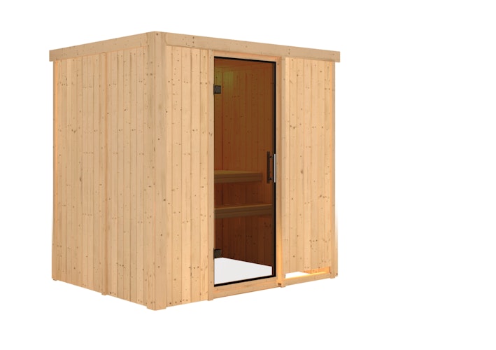Karibu Sauna Fanja - 68 mm Systemsauna - 230 Volt Plug & Play - Fronteinstieg inkl. Saunatür, Ofenschutzgitter, Kopfstütze und 2 Bänken. Lieferung je nach Wunsch ohne Ofen oder mit einem 3,6 kW Ofen mit interner Steuerung, 3,6 kW Ofen oder 3,6 kW Bio-Kombiofen jeweils mit externer Steuerung.
