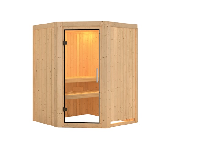 Karibu Sauna Larin mit Eckeinstieg inkl. Saunatür, Ofenschutzgitter, Kopfstütze und Espenholzbänken. Lieferung je nach Wunsch ohne Ofen oder mit einem 9 kW Ofen mit integrierter Steuerung, einem 9 kW Ofen mit externer Steuerung oder einem 9 kW Bio-Kombiofen mit externer Steuerung.
