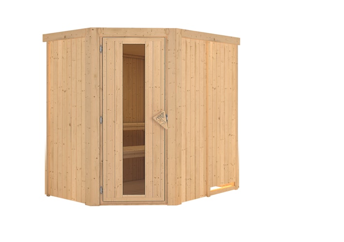 Karibu Sauna Saja - 68 mm Systemsauna - 230 Volt Plug & Play - Eckeinstieg inkl. Saunatür, Ofenschutzgitter, Kopfstütze und 2 Espenholzbänken. Lieferung je nach Wunsch ohne Ofen oder mit einem 3,6 kW Ofen mit interner Steuerung, 3,6 kW Ofen oder 3,6 kW Bio-Kombiofen jeweils mit externer Steuerung.