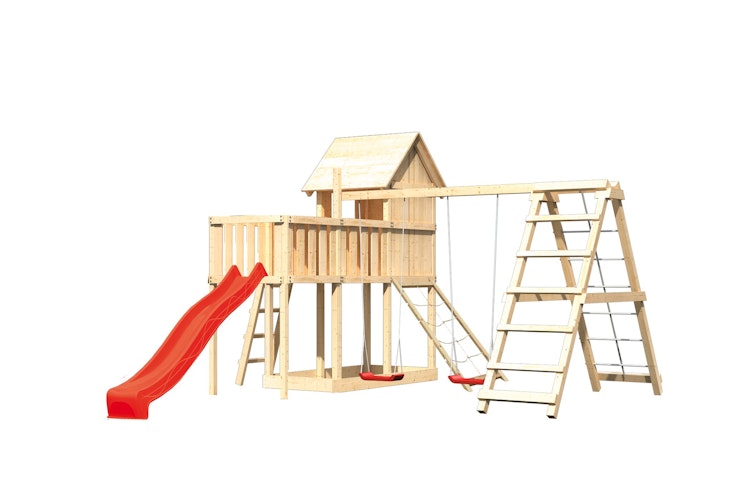 Karibu Akubi Stelzenhaus Frieda mit Wellenrutsche, Doppelschaukelanbau, Klettergerüst, Anbauplattform und Netzrampe