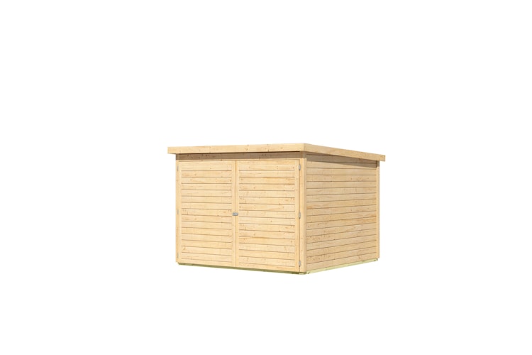 Karibu Fahrradgarage Inkl. Fahrradschienen (für 3 oder 4 Fahrräder) - 19 mm. Die Fahrradgarage wird aus 19 mm starken Wandbrettern aus nordischer Fichte im Steck-/Schraubsystem gefertigt und gewährleistet somit einen einfachen Aufbau. Die praktische und vormontierte Tür mit ihren großzügigen Abmessungen und dem Massivholzrahmen schützt Ihre Räder dank der Sicherheitsüberfalle effektiv vor unbefugtem Zugriff. Die Fahrradgarage enthält zusätzlich Einschübe und Halterungen für die Fahrradreifen.