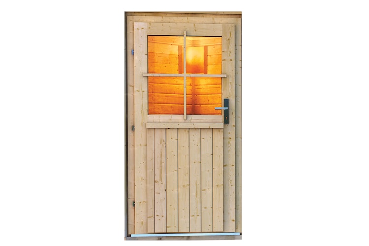 Klassische Sauna-Holztür mit Lichtausschnitt aus klarem Echtglas mit aufgesetzten Sprossen, Türrahmen aus Massivholz, Durchgangsmaß: ca. 78 x 175 cm, Einbaumaß B x T x H: ca. 83 x 4 x 177 cm, justierbare Türbänder für optimale Ausrichtung. Lieferung inkl. Alu-Türschwelle und Zylinderschloss mit 3 Schlüsseln.