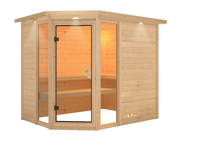 Karibu Sauna Sinai 3 - Massivholzsauna mit Eckeinstieg 38 mm inkl. Ganzglastür, Ofenschutzgitter, 2 Fensterelementen, Kopfstütze und Espenholzbänken. Lieferung je nach Wunsch ohne Ofen oder mit einem 9 kW (integrierte Steuerung), 9 kW (externe Steuerung) oder 9 kW Bio-Kombiofen (externe Steuerung) möglich.