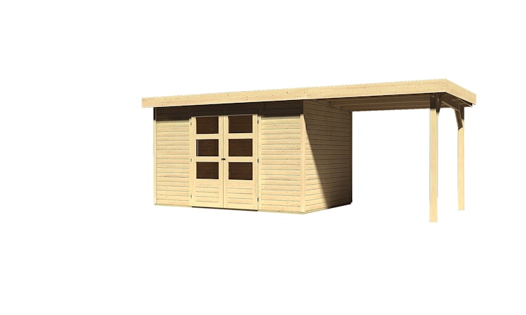 Mit dem Karibu/Woodfeeling Gartenhaus Askola liegen Sie voll im Trend. Das 16 mm Pultdach und die Doppelflügeltür runden das moderne Design perfekt ab. Bei diesem Set ist ein 225 cm breites Schleppdach (240 cm Dachstand) inklusive, das an beiden Seiten des Hauses montiert werden kann.