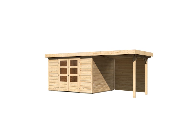 Mit dem Karibu/Woodfeeling Gartenhaus Askola liegen Sie voll im Trend. Das 16 mm Pultdach und die Doppelflügeltür runden das moderne Design perfekt ab. Bei diesem Set ist ein 225 cm breites Schleppdach mit Rückwand (240 cm Dachstand) inklusive, das an beiden Seiten des Hauses montiert werden kann.