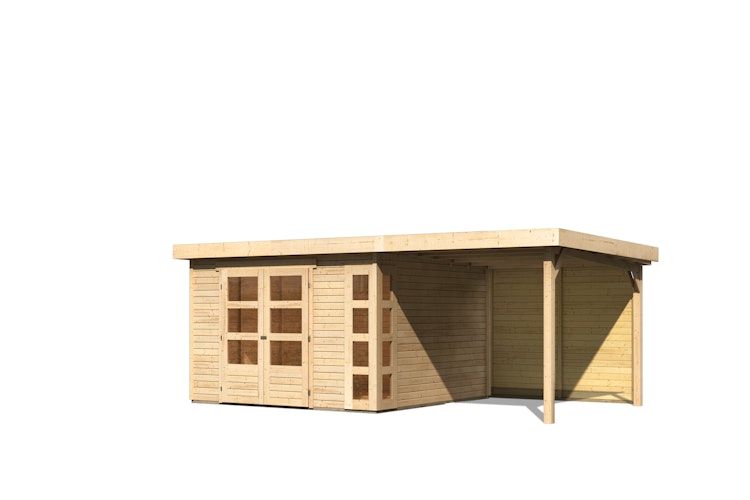 19 mm Karibu Woodfeeling Gartenhaus Kerko mit Flachdach und Doppeltür, erhältlich in 4 Größen, auf Wunsch in terragrau lackiert. Dieses besondere Haus bietet dank der Eck-Fenster einen besonders hellen Innenraum. Bei diesem Set ist ein 240 cm breites Schleppdach inklusive.