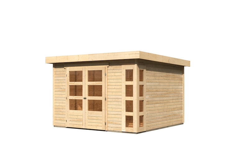 19 mm Karibu Woodfeeling Gartenhaus Kerko mit Flachdach und Doppeltür, erhältlich in drei Größen und zwei Farb-Ausführungen. Dieses besondere Haus bietet dank der Eck-Fenster einen besonders hellen Innenraum.