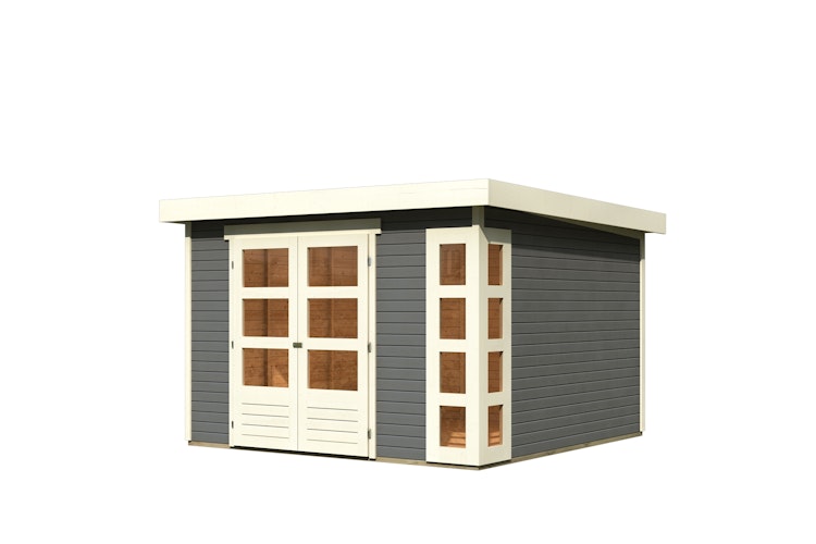 19 mm Karibu Woodfeeling Gartenhaus Kerko mit Flachdach und Doppeltür, erhältlich in drei Größen und zwei Farb-Ausführungen. Dieses besondere Haus bietet dank der Eck-Fenster einen besonders hellen Innenraum.