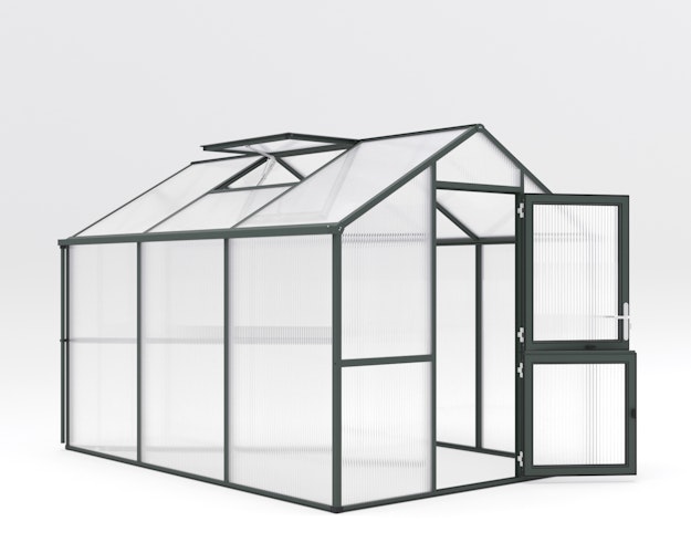 Das KGT Gewächshaus Iris kommt mit einer komfortablen Seiten-/Traufhöhe von 1,60 m und bietet dank der 16-mm-ISO-Hohlkammerplatten aus hochbruchfestem Polycarbonat perfekten UV-Schutz und eine hervorragende Wärmeisolierung. Die Lieferung des Gewächshauses umfasst eine breite, geteilte Drehtür, ein großes Dachfenster mit automatischem Fensterheber, ein Rückwandfenster sowie integrierte Regenrinnen mit Fallrohren.