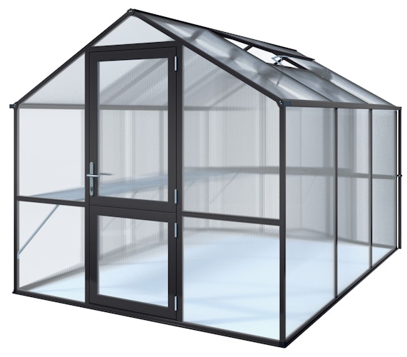 Das KGT Profi Gewächshaus Rose Typ III ist aus hochstabilen, korrosionsbeständigen Aluminiumprofilen gefertigt und enthält eine umfangreiche Grundausstattung: 2 Fenster, geteilte Drehtür, Regenrinne mit Fallrohren, automatischer Fensteröffner uvm.