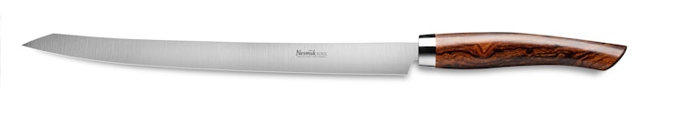 Der lange Nesmuk Slicer ist das perfekte Messer für die großen Aufgaben bei der Zubereitung. Mit einer Klingenlänge von 26 cm ist das halb-flexible Messer ultraleicht und bestens geeignet für lange und präzise Schnitte. Damit wird das Filetieren großer Fischen und das Schneiden hauchdünner Scheiben zum Kinderspiel. Der Niobstahl sorgt bei der langen und feinen Klinge für eine hohe Flexibilität und vermittelt gleichzeitig Stabilität bei vertikalem Schneiden. Die Eigenschaften des Stahls ermöglichen eine für Filetiermesser ungewöhnlich hohe Härte von 60 HRC.