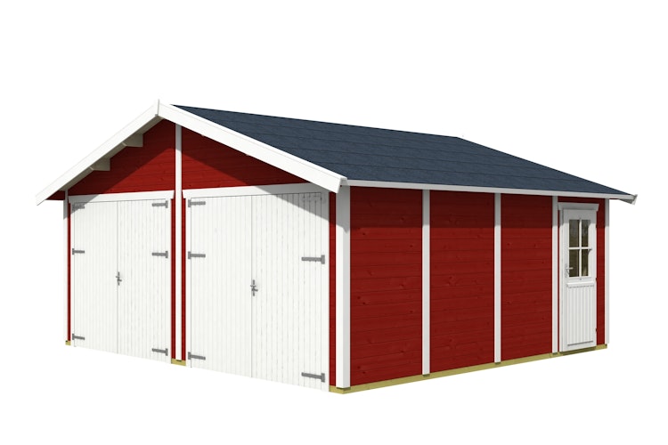 Doppelgarage: 570 cm x 525 cm (Varberg 3) - 45 mm Blockbohlen für die Wände, stumpfe Eckverbindung mit Eckpfosten