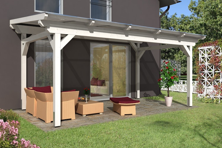 Die Terrassenüberdachungen Sanremo aus Leimholz  von Skan Holz können freistehend im Garten aufgestellt werden und sind somit räumlich flexibel und zugleich fassadenschonend - ohne Mittelpfosten.