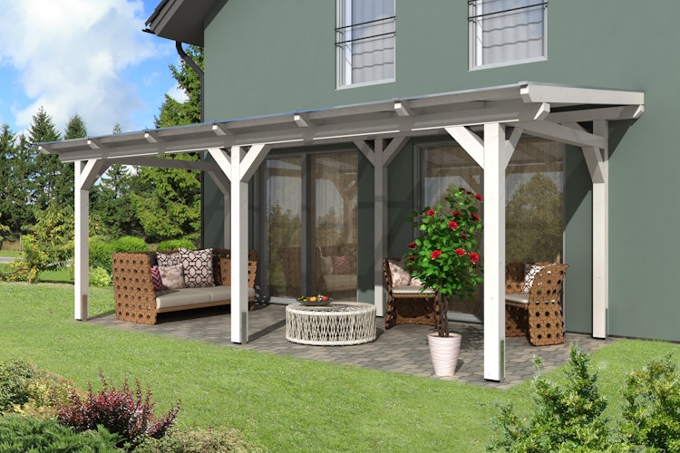Die Terrassenüberdachung Siena aus Leimholz von Skan Holz kann freistehend im Garten aufgestellt werden und ist somit räumlich flexibel und zugleich fassadenschonend.