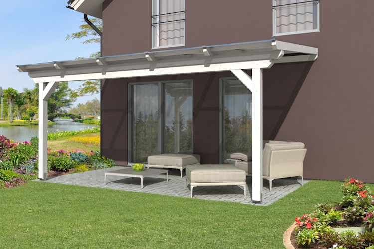 Robuste und langlebige Skan Holz Terrassenüberdachung Ancona aus hochwertigem Leimholz, ideal geeignet für farbige Anstriche - ohne Mittelpfosten.
