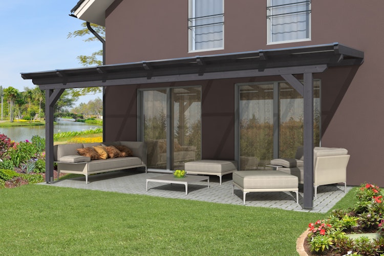• Robuste Terrassenüberdachung aus hochwertigem Leimholz ohne Mittelpfosten