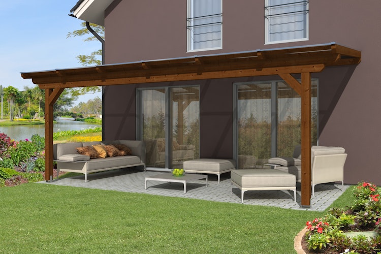 - Robuste Terrassenüberdachung aus hochwertigem Leimholz ohne Mittelpfosten