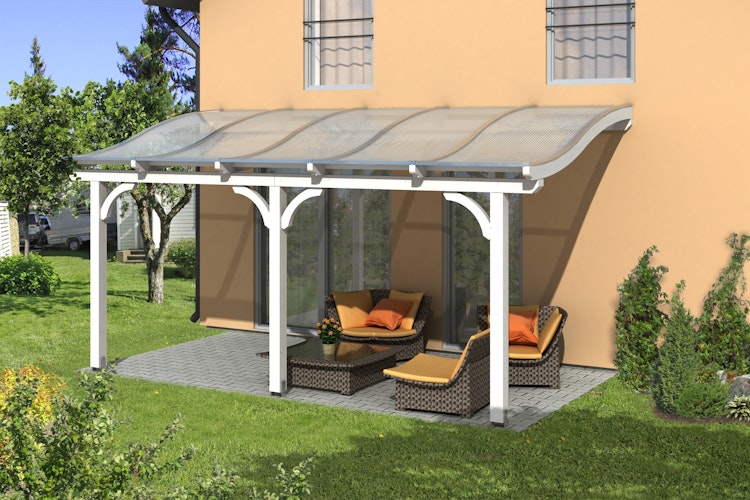 Stilvolle und langlebige Skan Holz Terrassenüberdachung Venezia aus hochwertigem, verwindungs- und rissarmem Leimholz, ideal geeginet für farbige Anstriche