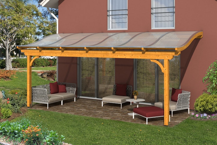 - Robuste Terrassenüberdachung aus hochwertigem Leimholz ohne Mittelpfosten