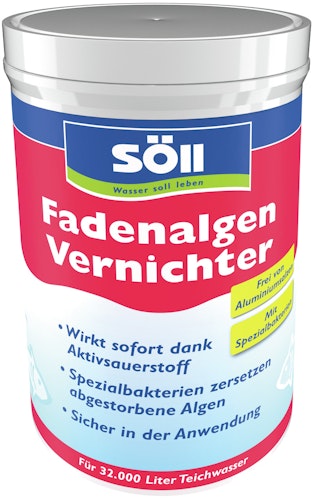 Algen sind für einen funktionierenden Gartenteich unerlässlich. Sie produzieren Sauerstoff und sind ein wichtiges Glied in der Nahrungskette. Sie müssen aber etwas unternehmen, wenn Ihr Gartenteich starken Algenwuchs aufweist. Denn ungebremstes Wachstum senkt die Karbonathärte und lässt den pH-Wert schwanken. Die Anti-Algenprodukte von Söll wirken gegen alle Algenarten und führen das Algenwachstum auf ein normales Maß zurück. Für klare, schöne Teiche. FadenalgenVernichter zerstört durch die sofortige Freisetzung von aktivem Sauerstoff selbst hartnäckigste Fadenalgen innerhalb von 24 Stunden. Bereits kurz nach der Anwendung können die abgestorbenen Algen abgekeschert werden. Verbleibende Algenreste werden durch die enthaltenen Spezialbakterien beschleunigt zersetzt. FadenalgenVernichter ist farblos und hochwirksam. Der Wirkstoff wird in wenigen Stunden zu Wasser und Sauerstoff abgebaut.