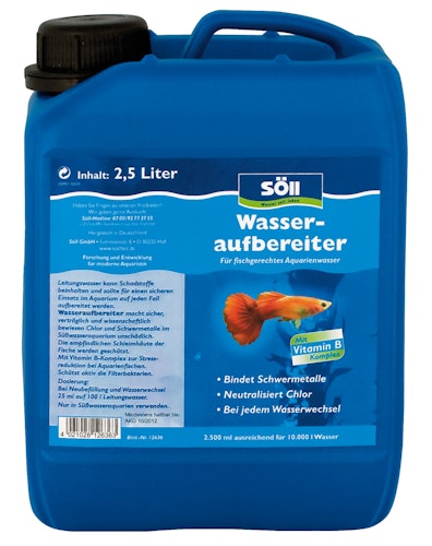 Der Söll Wasseraufbereiter sorgt für fischgerechtes Aquarienwasser. Leitungswasser kann mit Schadstoffen belastet sein und sollte für einen sicheren Einsatz im Aquarium immer aufbereitet werden. Wasseraufbereiter macht Chlor und Schwermetalle im Süßwasseraquarium zuverlässig unschädlich.
