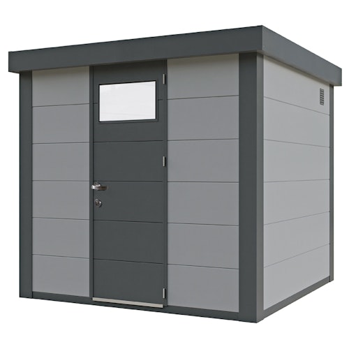 Das brandneue Telluria Metallgerätehaus Classico 2424 vereint edles Design mit perfekter Funktionalität! Das patentierte Metallbausystem sorgt für einen einfachen und schnellen Aufbau, eine hohe Belastbarkeit sowie eine UV- und witterungsbeständige Oberfläche mit 25 Jahren Garantie auf Korrosion. Das Dach wird inklusive Isolierung geliefert. Erhältlich in den Trendfarben granitgrau, lichtgrau und weiß.