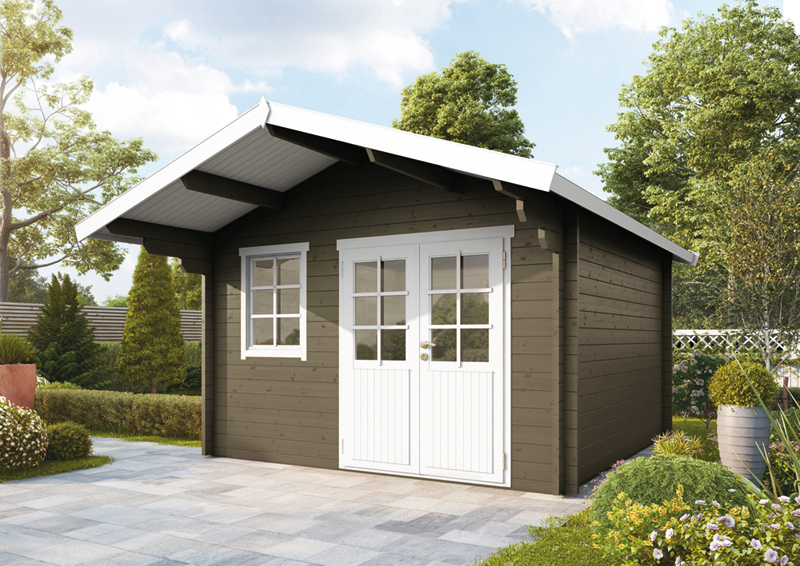 Mehr als nur ein Geräteschuppen! Das großzügig überstehende Vordach, die schönen Glasfenster und der Holzfußboden im Inneren machen dieses klassische Blockbohlenhaus zum gemütlichen Aufenthaltsort für Ihren Garten.