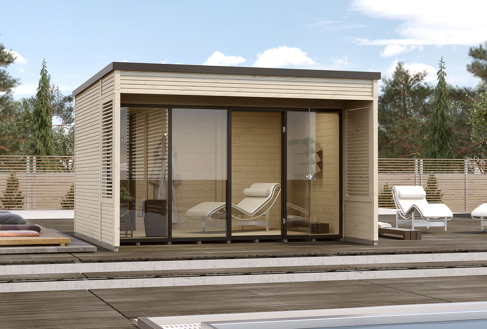 Mit dem überdachten Terrassenbereich und der großen Flügeltür erreichen Sie das maximale Outdoorerlebnis in Ihrem Gartenhaus - egal ob als Rückzugsort, Homeoffice oder, um Gäste zu empfangen und gemeinsam zu speisen.