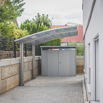 Der Ximax Design-Carport der Serie Portoforte steht im perfekten Einklang mit jeder Umgebung. Es werden ausschließlich hochwertigste Materialen verwendet: Eloxiertes, korrosionsbeständiges Aluminium sowie hitzeabweisendes Polycarbonat (Rauchglasgrau oder Klarmatt) für das Dach, welche das komplette Carport sehr flexibel und stabil machen. Die Ausführung Typ 60 kommt mit 2 Stützen (160 x 100 mm) sowie einer integrierten Dachrinne. Wir gehen gern auf individuelle Wünsche ein und montieren die Regenrinne auf der von Ihnen gewünschten Seite.