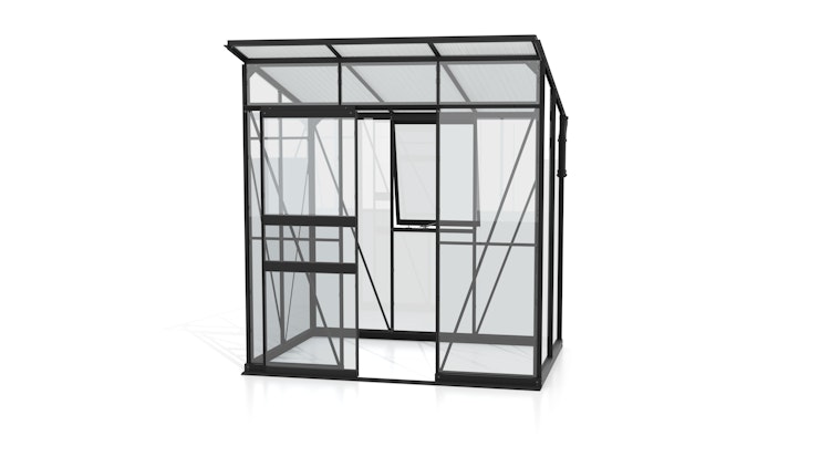 Dieses moderne Gewächshaus besticht durch einen geradlinigen Stil und bietet trotz kompakter Grundfläche eine beeindruckende Raumausbeute. Das Pultdach und der querformatige Grundriss sorgen für ein funktionales, zeitgemäßes Design, ergänzt durch eine solide Ausstattung, die einen wohnlichen Flair vermittelt. Die kugelgelagerte Schiebetür ermöglicht einen hindernisfreien Zugang, während ein aufstellbares Seitenfenster eine flexible Belüftung ähnlich der heimischen Bedingungen erlaubt. Für die Seiten stehen wahlweise kristallklares Sicherheitsglas oder gut isolierende Hohlkammerplatten zur Verfügung, während 6 mm Hohlkammerplatten auf dem Dach effektive Lichtbrechung und stabile Temperaturen gewährleisten. Die stabile Verglasung erstreckt sich über die gesamte Länge der Scheiben, unterstützt durch Kunststoffleisten an den Seiten und Einschubtechnik im Dach. Das leicht geneigte Dach optimiert den Sonneneinfall und der geringe Höhenunterschied ermöglicht eine effiziente Nutzung des Wachstumsraums. Zur Standardausstattung gehören außerdem Seitenfenster, ein 6 cm hoher Stahlfundamentrahmen mit ebener Türschwelle, Regenrinne und zwei Fallrohre.
